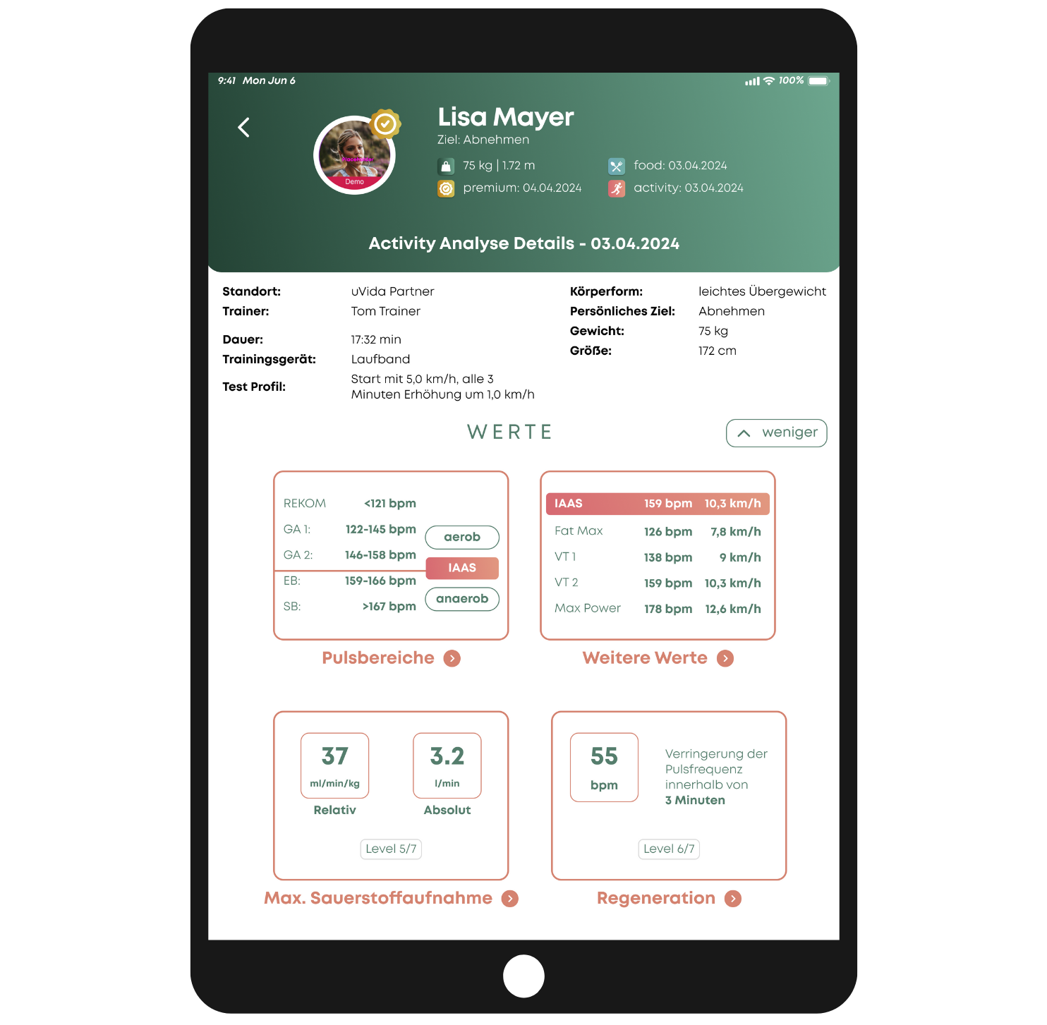 Mit uVida Activity kann durch einen Stufentest in ca. 20 bis 30 Minuten mittels der Messung der Atemgase exakt ermittelt werden, in welchen Pulsbereichen Training sinnvoll ist und wie man auf gesunde und nachhaltige Art und Weise seine Fitness- und Gesundheitsziele über Bewegung erreichen kann.